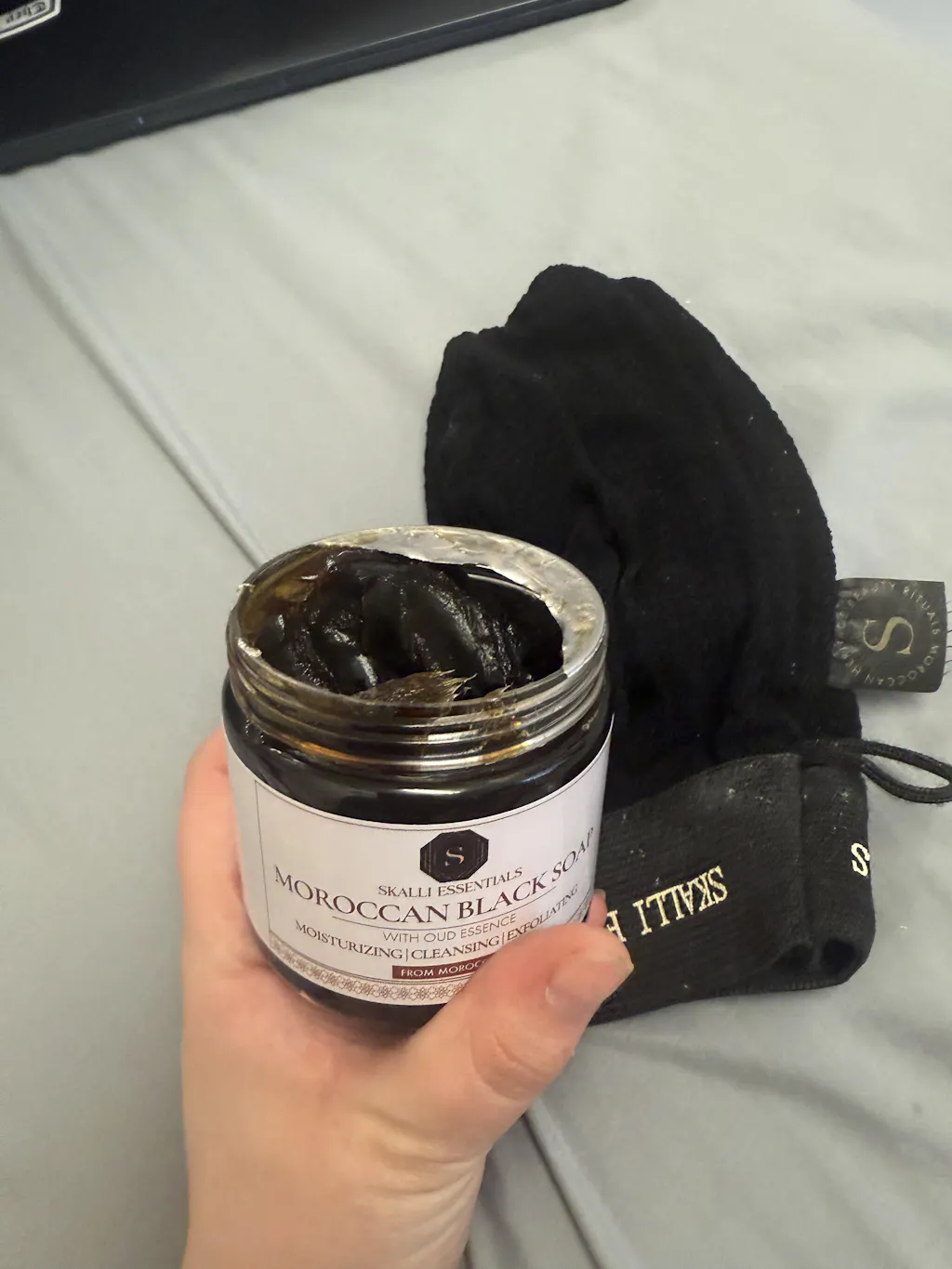 For the hammam experience in a bath or shower, apply a tablespoon of black soap on wet skin. Massage in circular motions and leave on for 5-10 minutes before rinsing with water. Then use the kessa mitt to scrub away dead skin cells. Moisturize your skin after the hammam.