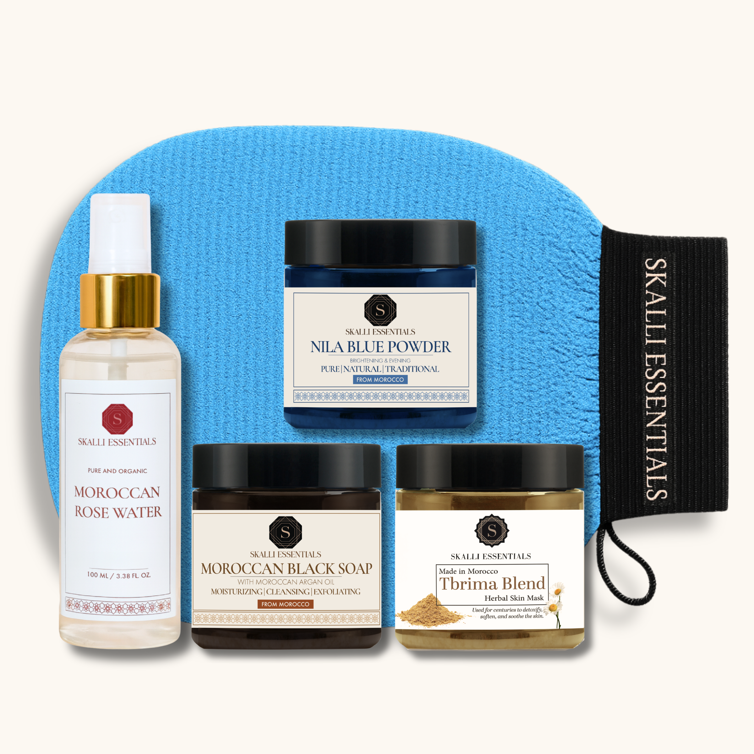 Moroccan Tbrima Powder Blend: Ghassoul Powder (Moroccan Lava Clay), Chickpea Powder, Rice Powder, Lavender Flower Powder, Chamomile Powder, Damask Rose Powder, Oregano Powder, Licorice Root Powder, Mugwort Powder, Rosemary Leaf Powder, Moroccan Aker Fassi Powder (Pomegranate Bark and Poppy Powder), Turmeric Root Powder