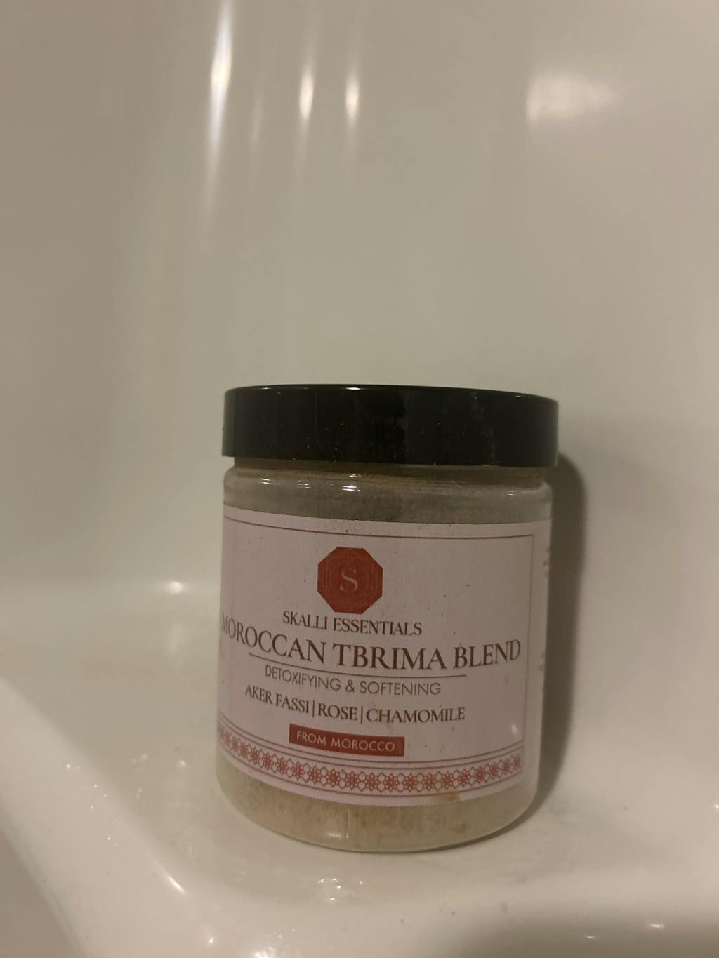 For the hammam process: In a bath or shower, mix a dollop of black soap with Tbrima powder and apply to the skin. Let it sit for 2-5 min before rinsing completely with water. Follow with a kessa glove to remove dead skin from the body and rinse.