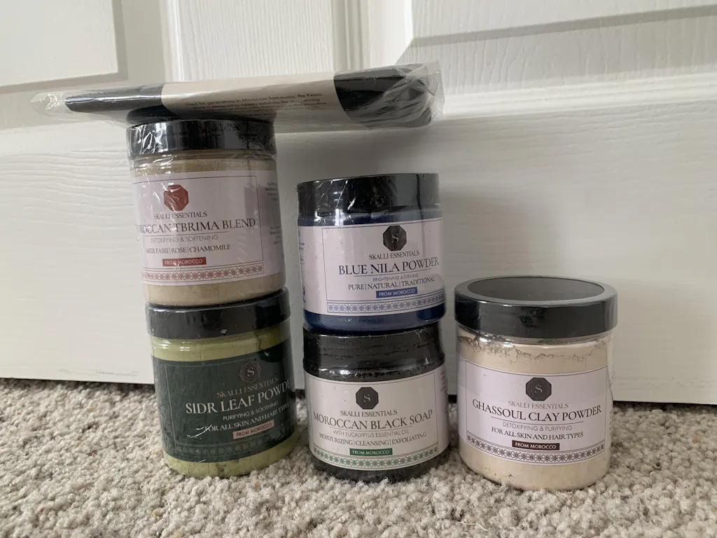 Ghassoul Powder (Moroccan Lava Clay), Chickpea Powder, Rice Powder, Lavender Flower Powder, Chamomile Powder, Damask Rose Powder, Oregano Powder, Licorice Root Powder, Mugwort Powder, Rosemary Leaf Powder, Moroccan Aker Fassi Powder (Pomegranate Bark and Poppy Powder), Turmeric Root Powder